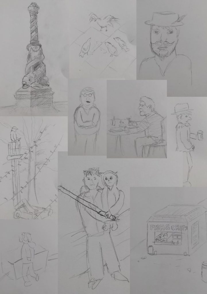 Out of my 10 sketches I picked one and turned into the middle of a story by creating a beginning and end. I wanted to make a story with a comedic twist and I came up with an alien that scares away the man who runs away, only to go and sit next to the old lady on the bench and read a book. This rotation taught me to create quick rough sketches rather than getting caught up in capturing the small details which is what I usually do. It was also a lot of fun turning the sketches into part of a story.
